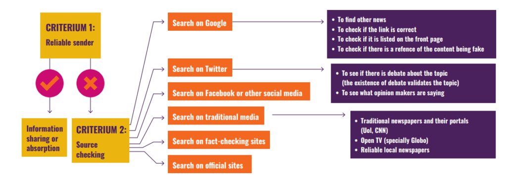 At the same time, users increasingly find themselves in an environment threatened by what they call “fake news,” where mistrust of any content grows, and various criteria for checking and passing on information are forged. In a process that involves factors such as individual values, affinity with beliefs, ideas and other users, and trust in peers, among others, people create their checking strategies, resorting to external sources to verify authenticity before sharing information, political messages, or even a link. This dynamic makes WhatsApp become an information distribution channel whose reliability is built on other platforms or relationships.