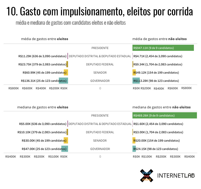 A exceção foi a corrida presidencial, da qual saiu eleito um candidato que não declarou gastos com impulsionamento, enquanto seus rivais (dos 13 candidatos, nove impulsionaram) tiveram um gasto mediano de R$ 469 mil com a prática.