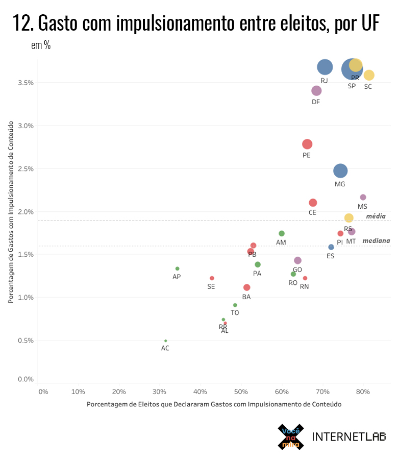 No recorte por unidades da federação, Santa Catarina, Mato Grosso do Sul e o Paraná lideram o ranking de porcentagem de candidatos eleitos que impulsionaram conteúdo com 81,4%, 80% e 78,2%, respectivamente. Na base, com os menos porcentuais, estão Acre (31,4%), Amapá (34,3%) e Sergipe (42,9%).