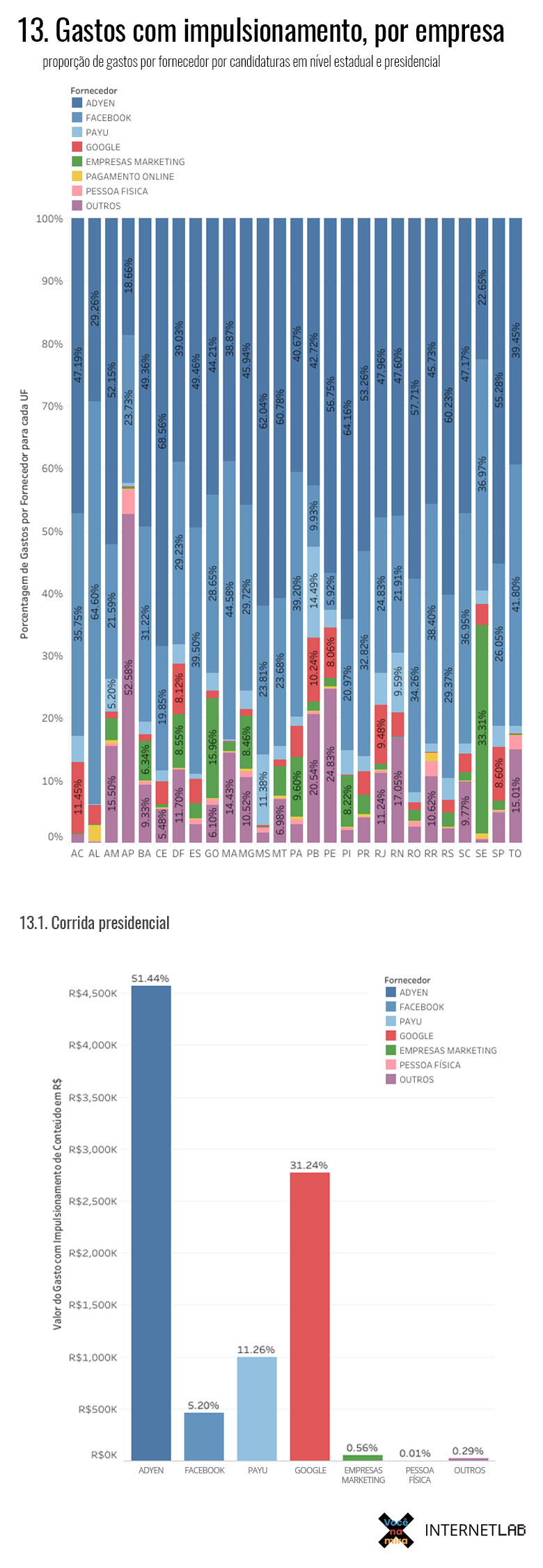 O gráfico acima apresenta as porcentagens de gastos declarados por fornecedor de serviço, por UF. Do total declarado com impulsionamento (R$ 77,2 milhões), 80,2% teve como destino o Facebook (nessa conta, entram intermediárias de pagamento como PayU e Adyen), e 8,1%, o Google.