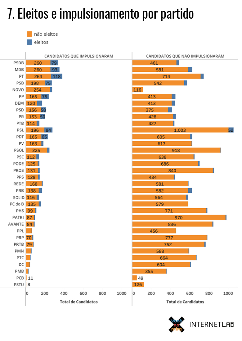 “De modo geral, partidos mais tradicionais e incumbentes na política, tais como PT, PP, MDB, PSDB, DEM, tiveram maiores gastos de campanha e direcionaram mais recursos para impulsionamento. Esse padrão pode ser explicado pelo fato de tais legendas terem acesso a parcelas maiores do fundo partidário o que, após a proibição do financiamento empresarial de campanhas, ganhou ainda mais relevância nessas eleições. Em contraste, partidos emergentes que adotaram um discurso de renovação, como é o caso do NOVO, do PSOL, e do PSL, gastaram menos tanto no total das campanhas, como também com impulsionamento de conteúdo (abaixo da linha), mas também tinham acesso a porções menores do fundo eleitoral.”