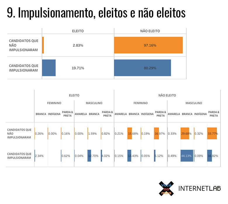 No agregado, o quadro a que chegamos é o seguinte: entre os candidatos que impulsionaram conteúdo, 19,7% foram eleitos, contra 2,83% que alcançaram a eleição mesmo sem impulsionar publicações nas redes sociais.