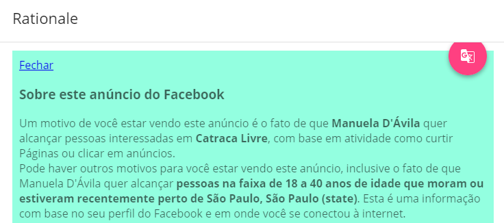 Rationale de anúncio veiculado por Manuela D’Ávila para pessoas interessadas em Catraca Livre
