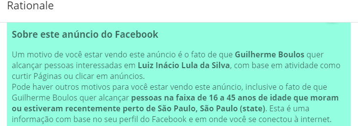 Rationale de anúncio veiculado por Boulos para pessoas interessadas em Luiz Inácio Lula da Silva