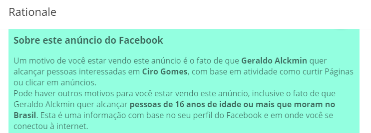 Rationale de anúncio veiculado por Geraldo Alckmin para pessoas interessadas em Ciro Gomes