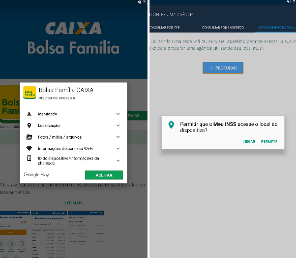 App do Bolsa Família faz pedido generalizado no momento da instalação do app. App Meu INSS solicita acesso a dados de localização quando acionada a funcionalidade ‘encontre uma agência’.