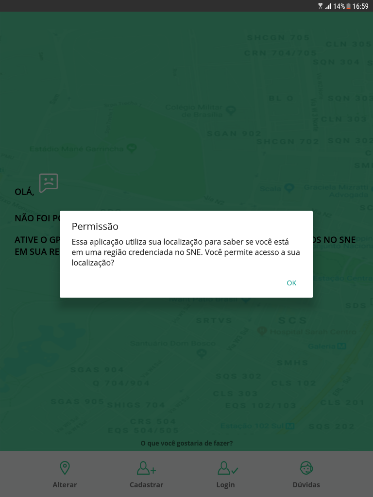 App do SNE pede permissão para o uso da localização indicando o objetivo do acesso a essa informação.