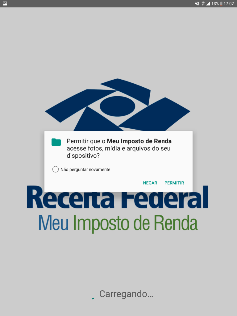 Permissão de acesso a fotos, mídias e arquivos exigida pelo aplicativo Meu Imposto de Renda na inicialização do aplicativo.