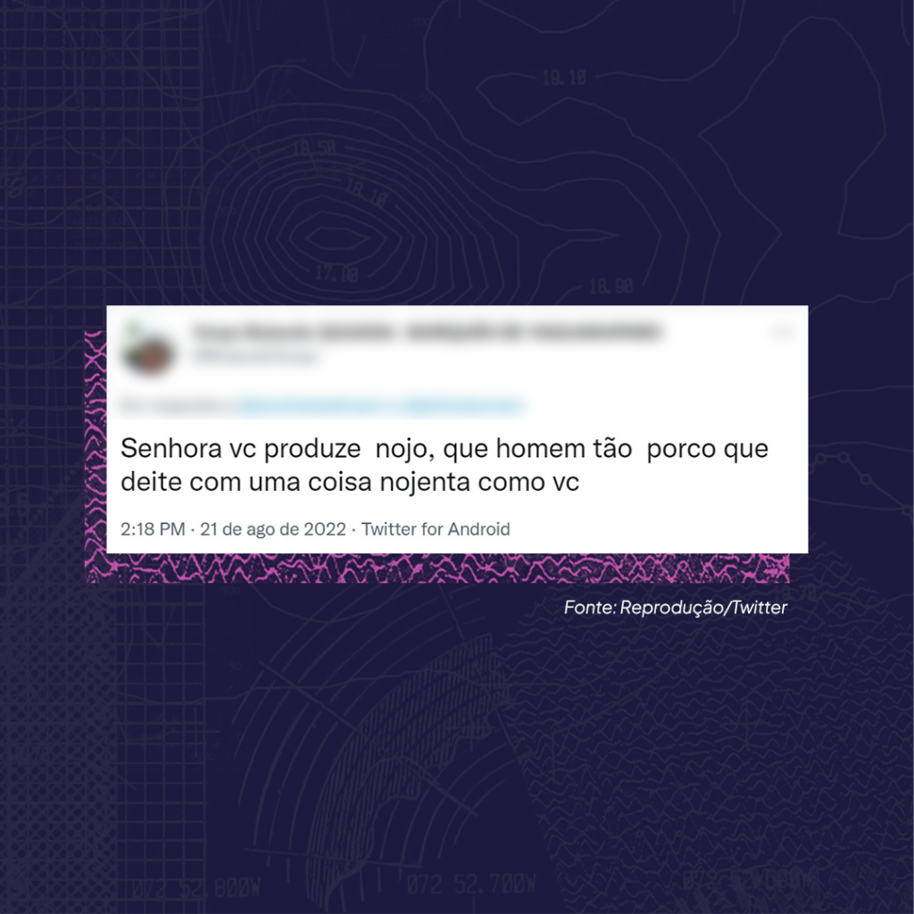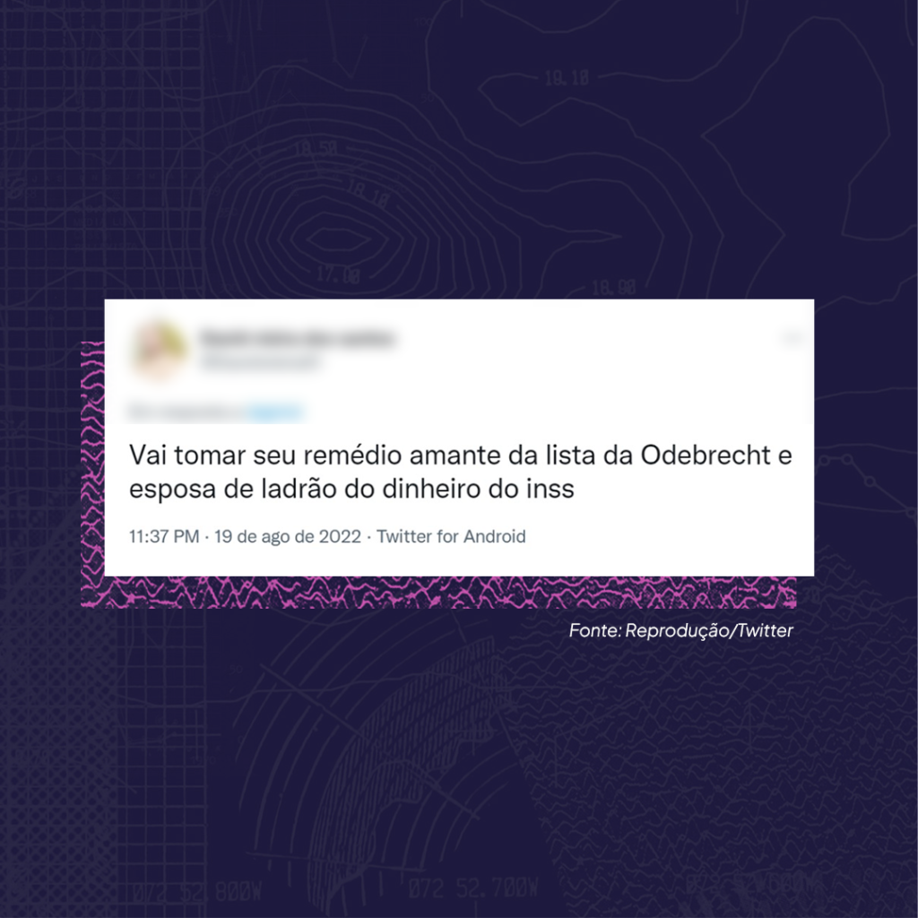 Outra opositora do bolsonarismo, Gleisi Hoffmann (PT-PR), que concorre ao Senado, é a segunda mais ofendida (822 xingamentos). No caso da petista, a maior parte das agressões a relaciona com corrupção e com o apoio ao ex-presidente e atual candidato Luís Inácio Lula da Silva. As ofensas são predominantemente de “amante”, “tome vergonha” e “mentirosa”. Aparecem ainda “ridícula”, “ladra”, “corrupta” e acusações de “defensora de criminosos”. Alguns tweets reúnem tantas agressões que fica explícita a finalidade exclusiva de atacar e dificultar a presença da candidata na rede.
