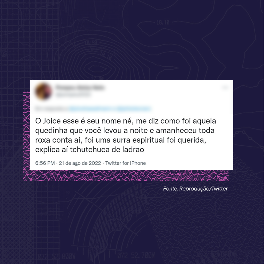 Joice Hasselmann (PSDB-SP) – ela de novo – recebeu quase metade das ofensas mapeadas (2070). Ela é alvo preferencial dos apoiadores do presidente e candidato Jair Bolsonaro (PL). Além dos termos gordofóbicos, desumanizadores e misóginos, também a perseguem por ter rompido com o antigo aliado. “Peppa pig”, “porca”, “traíra/traidora”, “ridícula” e “tome vergonha” ou “você é uma vergonha” são os termos mais encontrados, além de mais de 50 referências à violência física sofrida pela deputada em 2021.