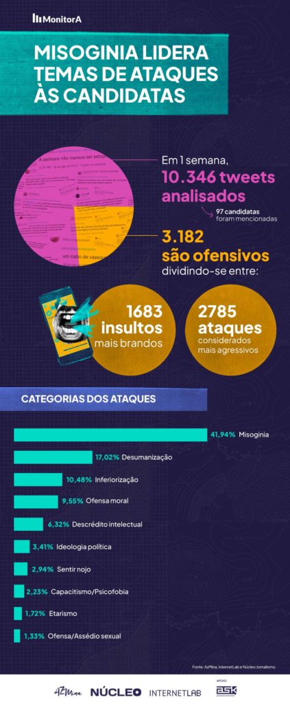 Foram monitorados 200 perfis de candidatas – 175 mulheres e 25 homens – no Twitter. Entre 17 e 22 de agosto, o levantamento resultou em 130.454 tweets direcionados a elas. A partir de um dicionário composto de palavras ofensivas, misóginas, sexistas, racistas, lesbo, trans e homofóbicas, coletamos, neste mesmo intervalo, 11.837 tuítes que continham as palavras deste léxico ofensivo, mas que precisavam de um olhar de contexto para determinar se eram ataques ou não. Em seguida, excluindo linhas repetidas desta amostra inicial, fizemos uma análise qualitativa de 10,3 mil tweets. Todos foram lidos um a um por um grupo de 8 codificadoras, para identificar se o conteúdo era ou não um ataque, ou insulto direcionado às candidatas. Os dados foram analisados quantitativamente a partir dessa categorização manual. Todas as porcentagens apresentadas na matéria são referentes a estes 10,3 mil tweets analisados qualitativamente.