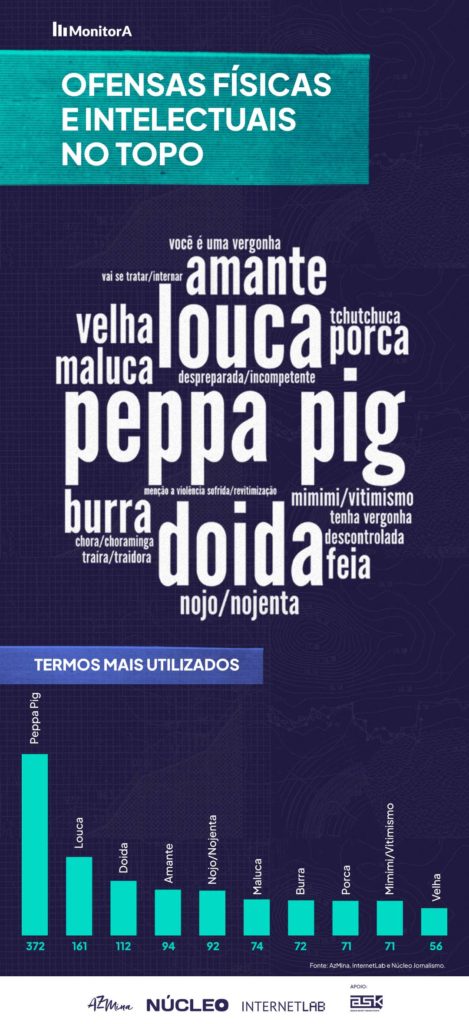 O discurso misógino é o principal tipo de ofensa, acompanhado de narrativas que diminuem as candidatas subestimando sua capacidade intelectual, insultam seus corpos e questionam sua moral. Há ainda a presença de termos racistas, com preconceito étnico ou regional.