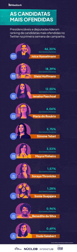 Uma olhada rápida para o ranking de candidatas mais atacadas na primeira semana de campanha mostra ofensas distribuídas por todos os espectros políticos e voltadas a pessoas de diferentes grupos étnicos.