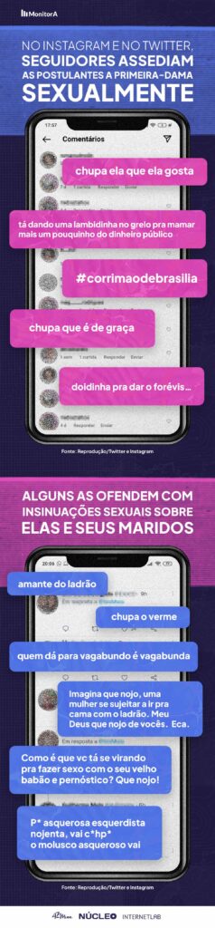 Atenção: A reportagem abaixo mostra trechos explícitos de conteúdo misógino, de ofensas sexuais e de intolerância religiosa. Optamos por não censurá-los porque achamos importante exemplificar como o debate é violento na internet, como a violência política contra mulheres se espalha pelas redes e é sexista em suas formas, como podemos identificá-la e quais termos foram direcionados às postulantes a primeira-dama.