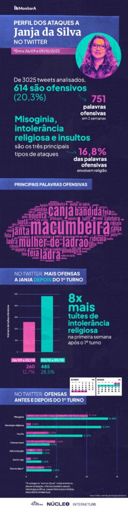 No caso de Janja, que não faz autodeclaração de religião, o número de ataques aumentou depois do primeiro turno, especialmente quando questões religiosas ganharam destaque, tanto na campanha de Lula quanto na de Bolsonaro. Se antes da votação, 12% das menções analisadas no Twitter eram ofensivas, na semana seguinte o número subiu para 27%.