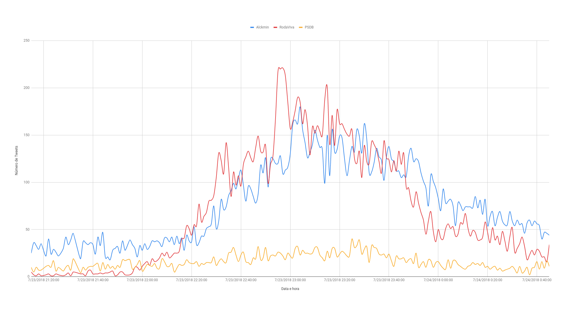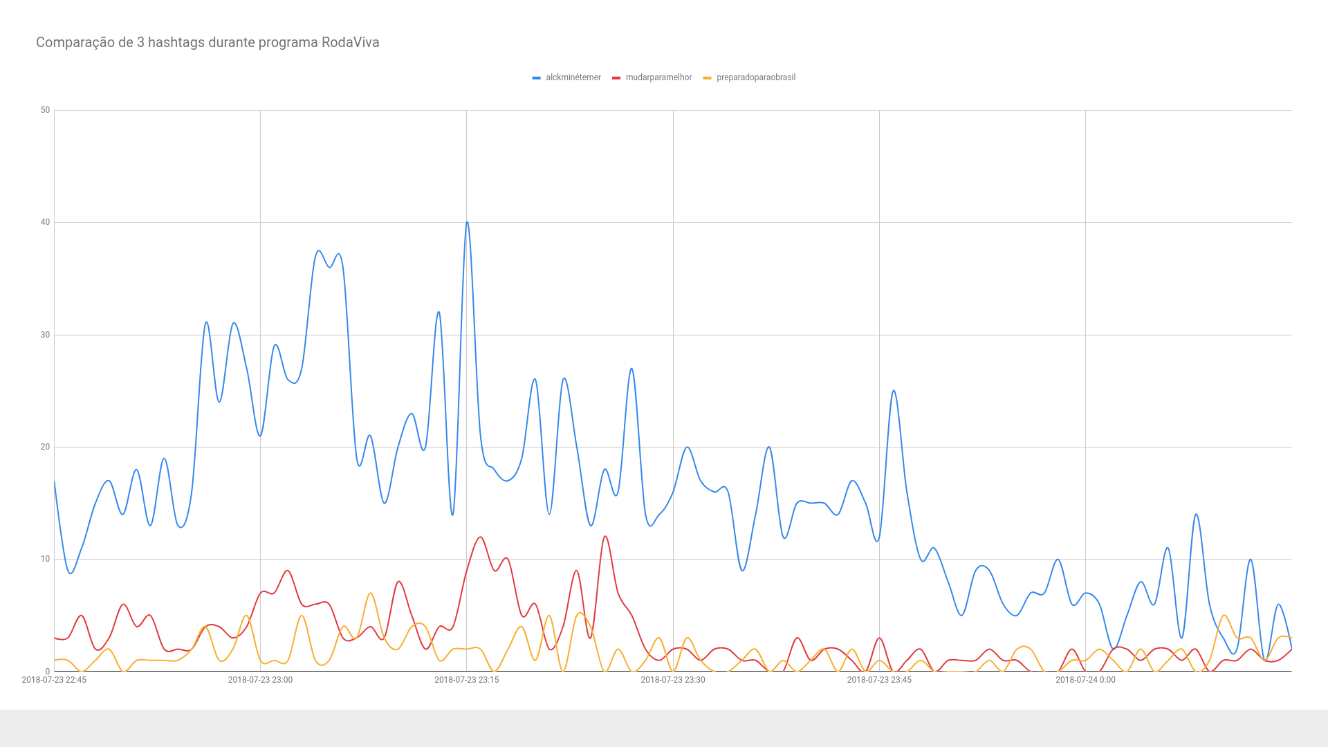 É importante ressaltar que a hashtag #AlckminÉTemer foi utilizada de maneira pontual por alguns usuários antes do programa, passando a ser altamente veiculada com o início da exibição. O tuíte mais antigo que encontramos é de um dia anterior ao programa, às 16h45 (https://twitter.com/remuspjr/status/1020454684061052928). Contudo, no dia da exibição, a conta @AlemD4sSombras – a qual foi identificada em nossa rede de retuítes acima -, às 15h54, veiculou uma mensagem que divulgava a participação de Alckmin no Roda Viva e solicitava que os usuários subissem a hashtag #AlckminÉTemer (https://twitter.com/AlemD4sSombras/status/1021529019681001475).