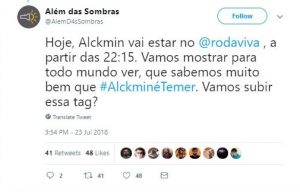 O monitoramento revelou a súbita expansão da hashtag #AlckminÉTemer, a qual alcançou, durante a transmissão, a marca de 40 tweets por minuto – além de ter assumido o segundo lugar nos Trending Topics Brasil, ficando abaixo apenas da hashtag #RodaViva.