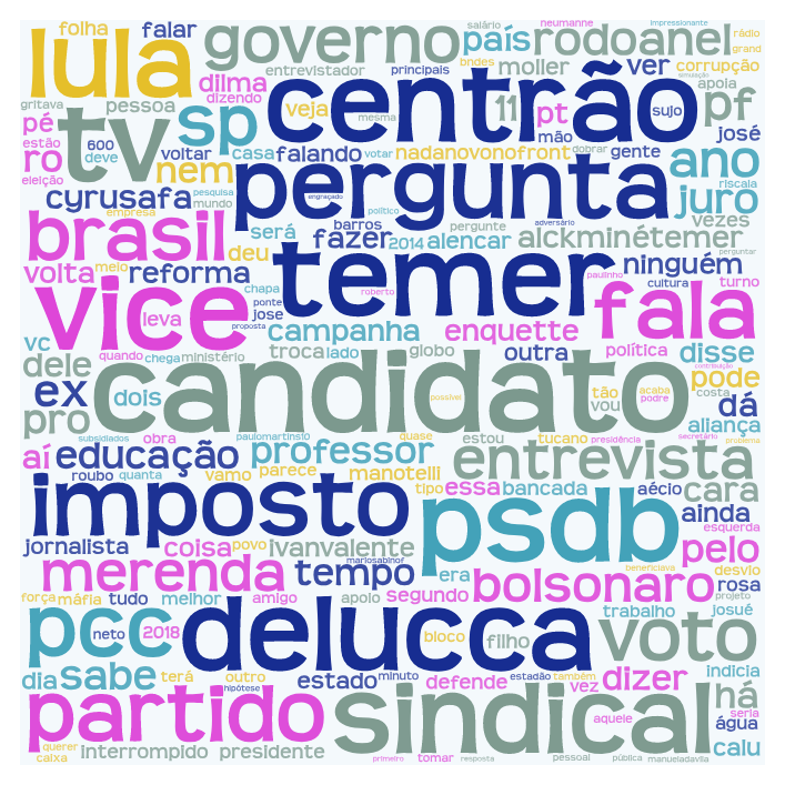 A nuvem de tags abaixo exibe os termos que mais apareceram durante a exibição do programa em tuítes que continham o nome “Alckmin”. Os termos “centrão”, “temer”, “candidato”, “psdb”, “partido”, “vice”, “pergunta” e “imposto sindical” foram empregados com grande frequência.