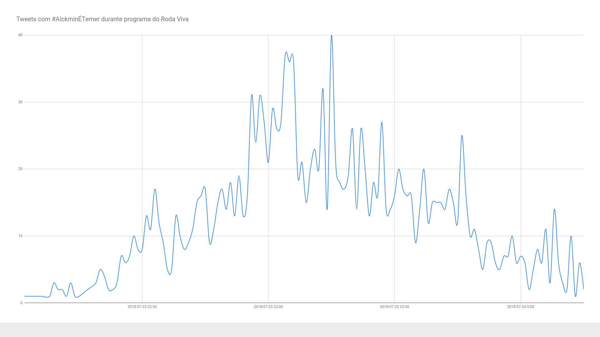 É importante ressaltar que a hashtag #AlckminÉTemer foi utilizada de maneira pontual por alguns usuários antes do programa, passando a ser altamente veiculada com o início da exibição. O tuíte mais antigo que encontramos é de um dia anterior ao programa, às 16h45 (https://twitter.com/remuspjr/status/1020454684061052928). Contudo, no dia da exibição, a conta @AlemD4sSombras – a qual foi identificada em nossa rede de retuítes acima -, às 15h54, veiculou uma mensagem que divulgava a participação de Alckmin no Roda Viva e solicitava que os usuários subissem a hashtag #AlckminÉTemer (https://twitter.com/AlemD4sSombras/status/1021529019681001475).
