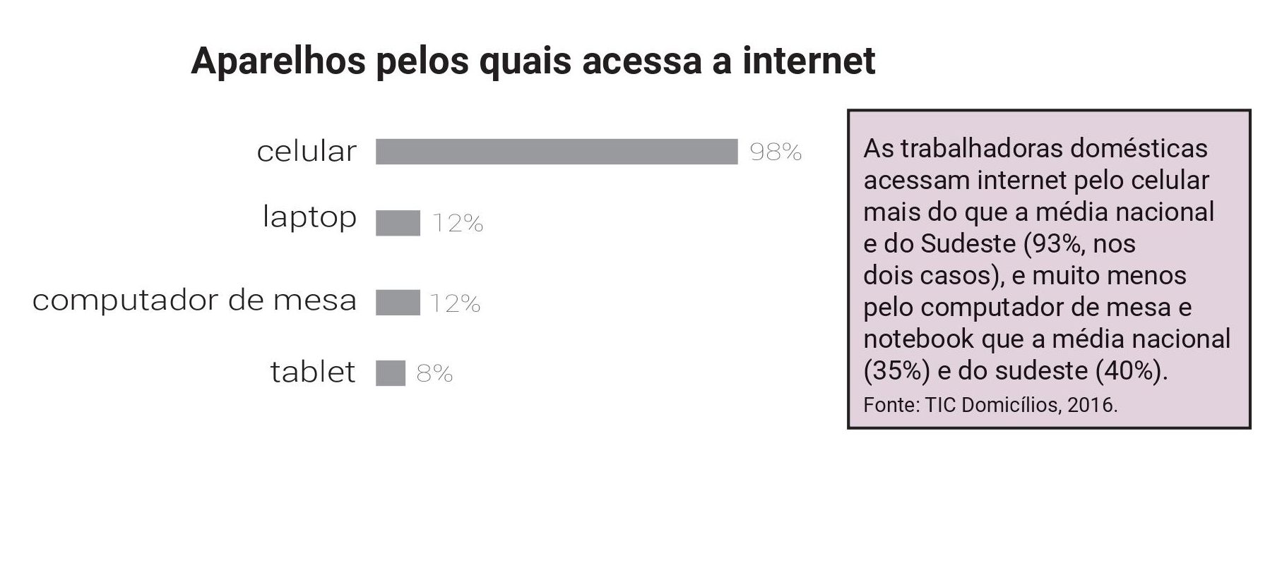A pesquisa revelou dados importantes sobre a forma de acesso à Internet pelas trabalhadoras domésticas da grande São Paulo. Em primeiro lugar, há uma grande prevalência do acesso por meio de celulares pré-pagos (98% das usuárias de Internet acessam pelo celular), e majoritariamente com planos pré-pagos (64% delas). 40% dessas mulheres acessam a Internet há entre 5 e 10 anos, o que coincide com a popularização dos smartphones.