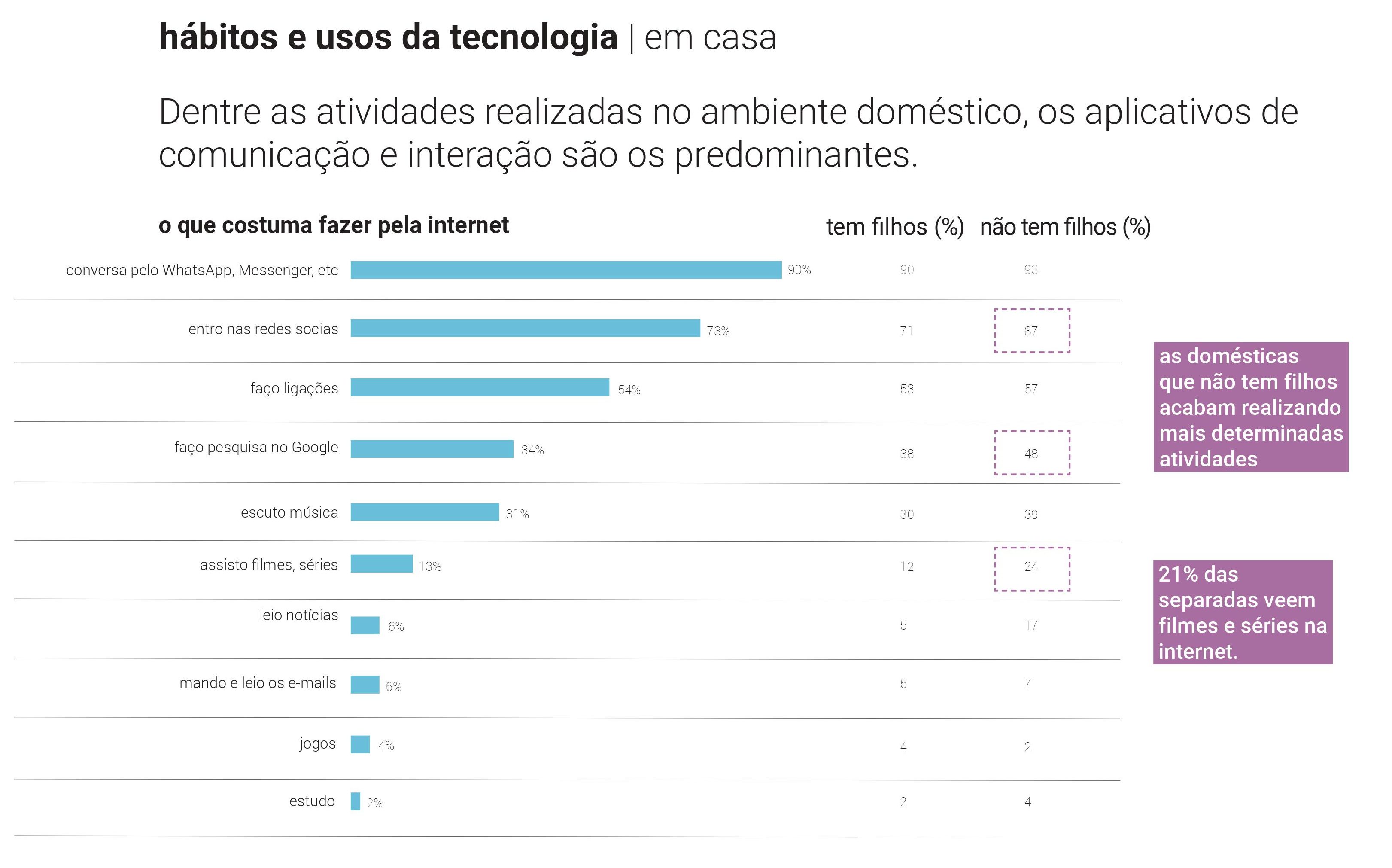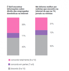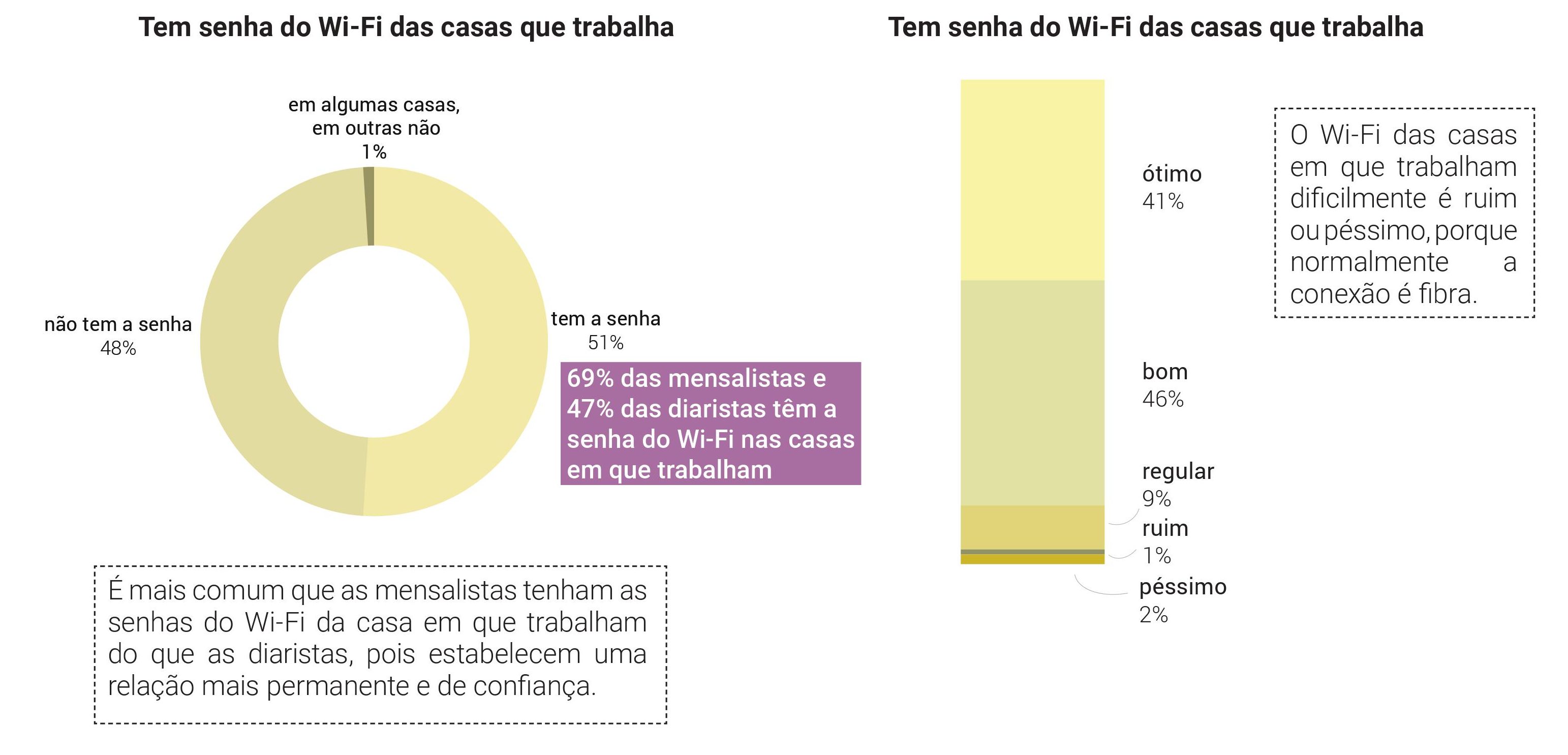 A pesquisa indicou também que metade das trabalhadoras domésticas não têm a senha do wi-fi nas casas onde trabalham, seja por proibição ou por autocensura: muitas afirmaram que usar a internet durante o trabalho atrapalha, e que elas preferem acabar o trabalho logo e sair mais cedo; outras, que preferem não usar porque, afirmam, assim evitam desconfianças.