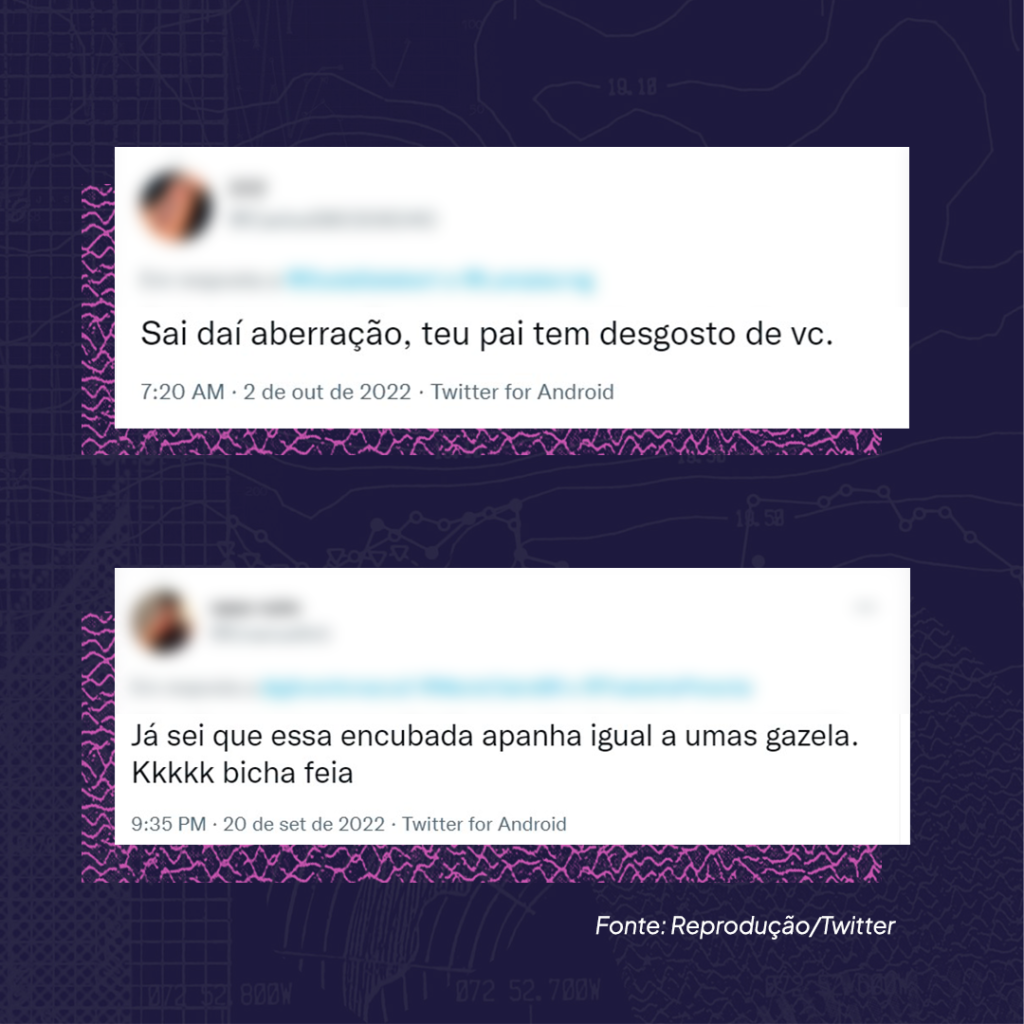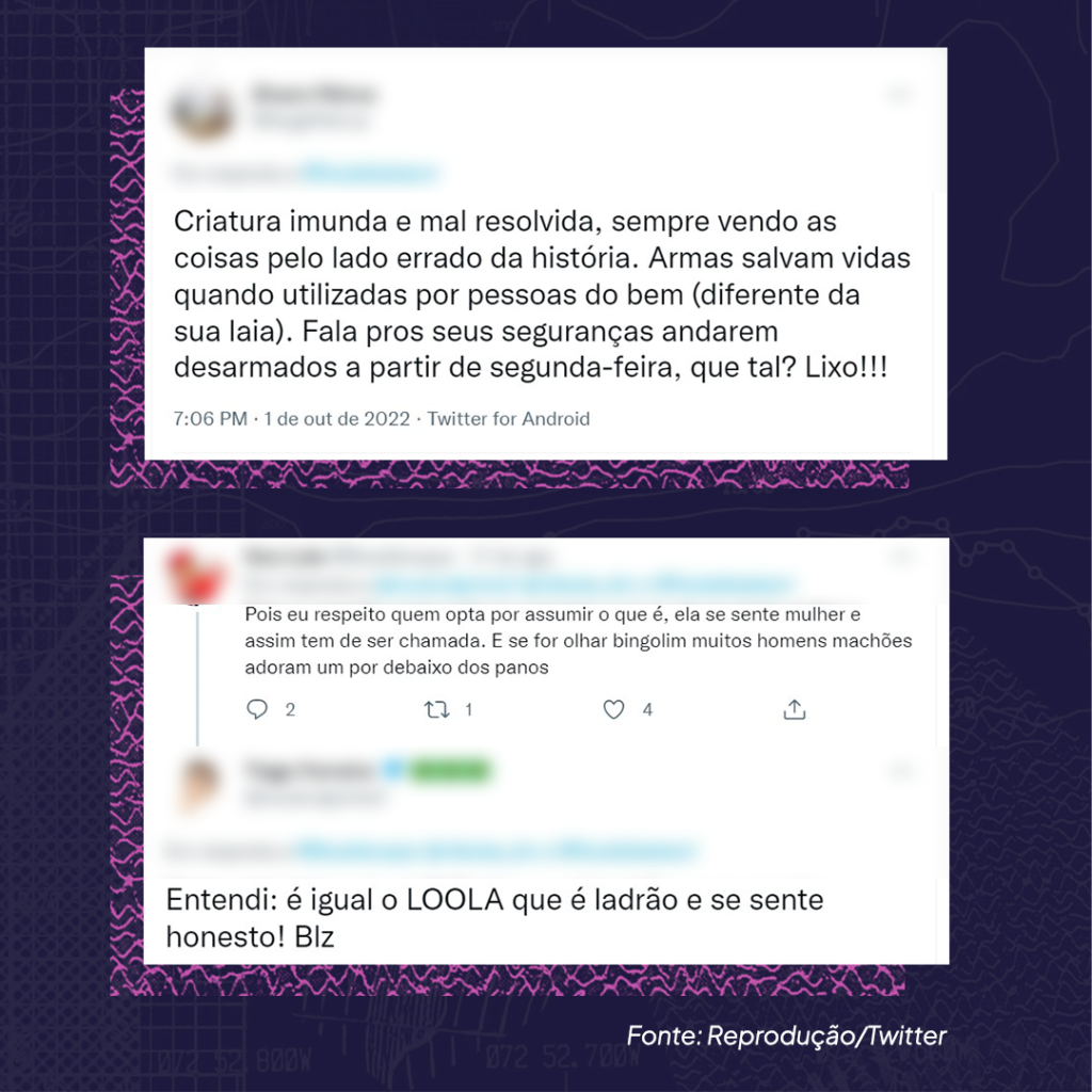 Depois dos comentários transfóbicos, os insultos, como “hipócrita“ e “ridícula“, são a segunda maior categoria de hostilidade (18 tuítes), seguidos por xingamentos com termos como “imbecil“, “burra“ e “jumenta“, que promovem o descrédito intelectual das candidatas (15). Os relacionados à ideologia política (12) usam termos como “militonta“, “psolenta“ e “petista nojenta“. As ofensas misóginas (8) acusam as candidatas de fazerem “mimimi“, entre outros comentários ofensivos.