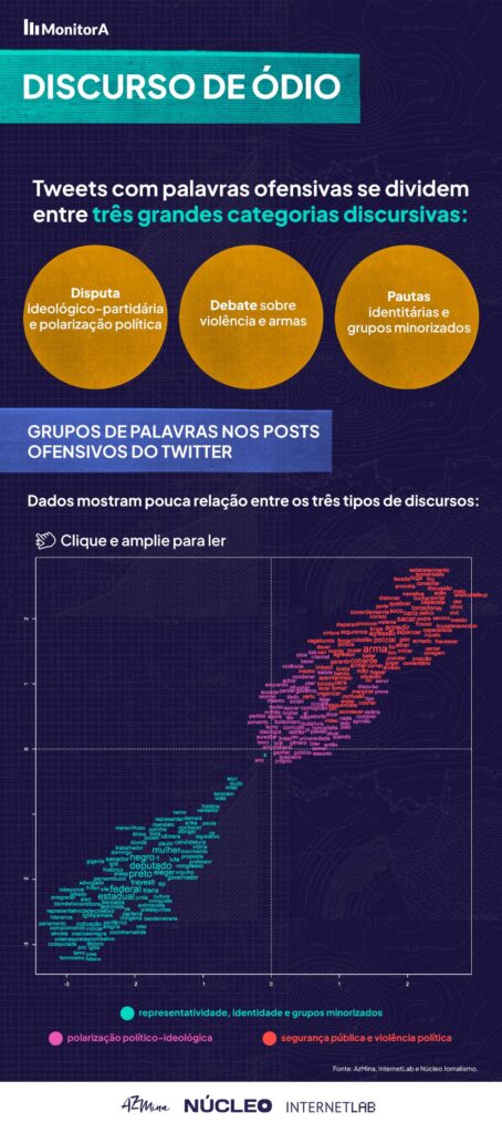 No Twitter, o MonitorA coletou inicialmente 62 mil tuítes, mas a análise se concentrou nos 6 mil que incluíam termos potencialmente ofensivos. Nessa amostra, as interações hostis com as candidatas trans e travestis se concentraram em três grupos: polarização política e ideológico-partidária; segurança pública e violência política; e representatividade, identidade e grupos minorizados.