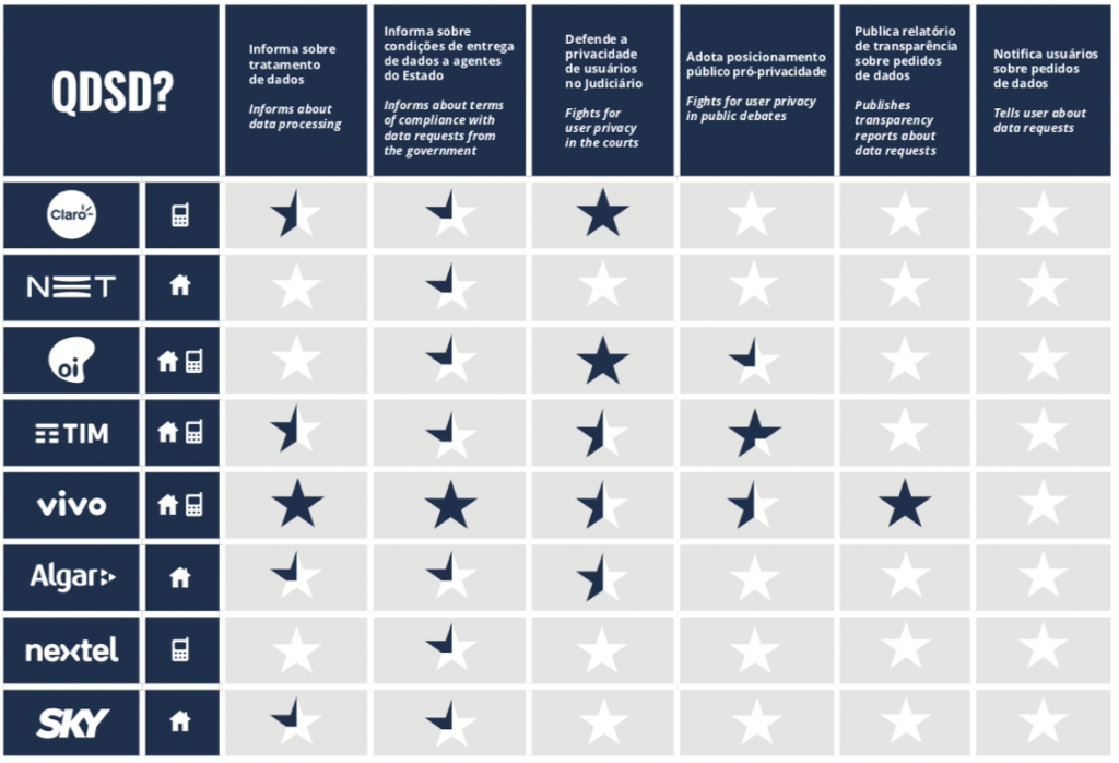 A maior parte das empresas opta por fornecer informações genéricas sobre a forma como processam pedidos de quebra de sigilo, simplesmente colocando que observam a Constituição e demais leis aplicáveis. Esse ano, apenas a Vivo se esforçou em fornecer informações aos seus clientes nesse sentido em seu informe de Transparência de Comunicações.